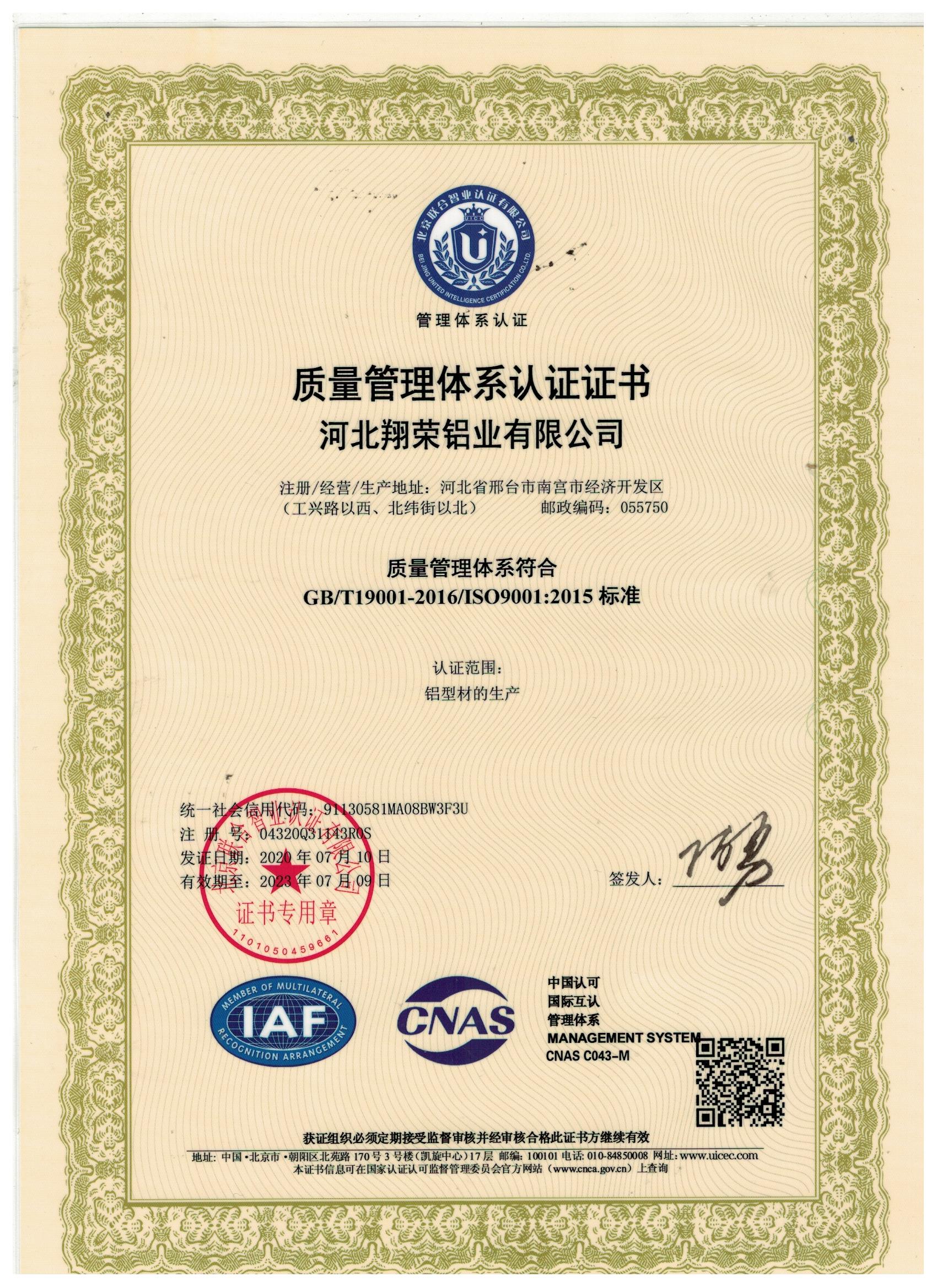 【概要描述】河北翔榮鋁業(yè)有限公司榮獲9001質(zhì)量管理體系認(rèn)證